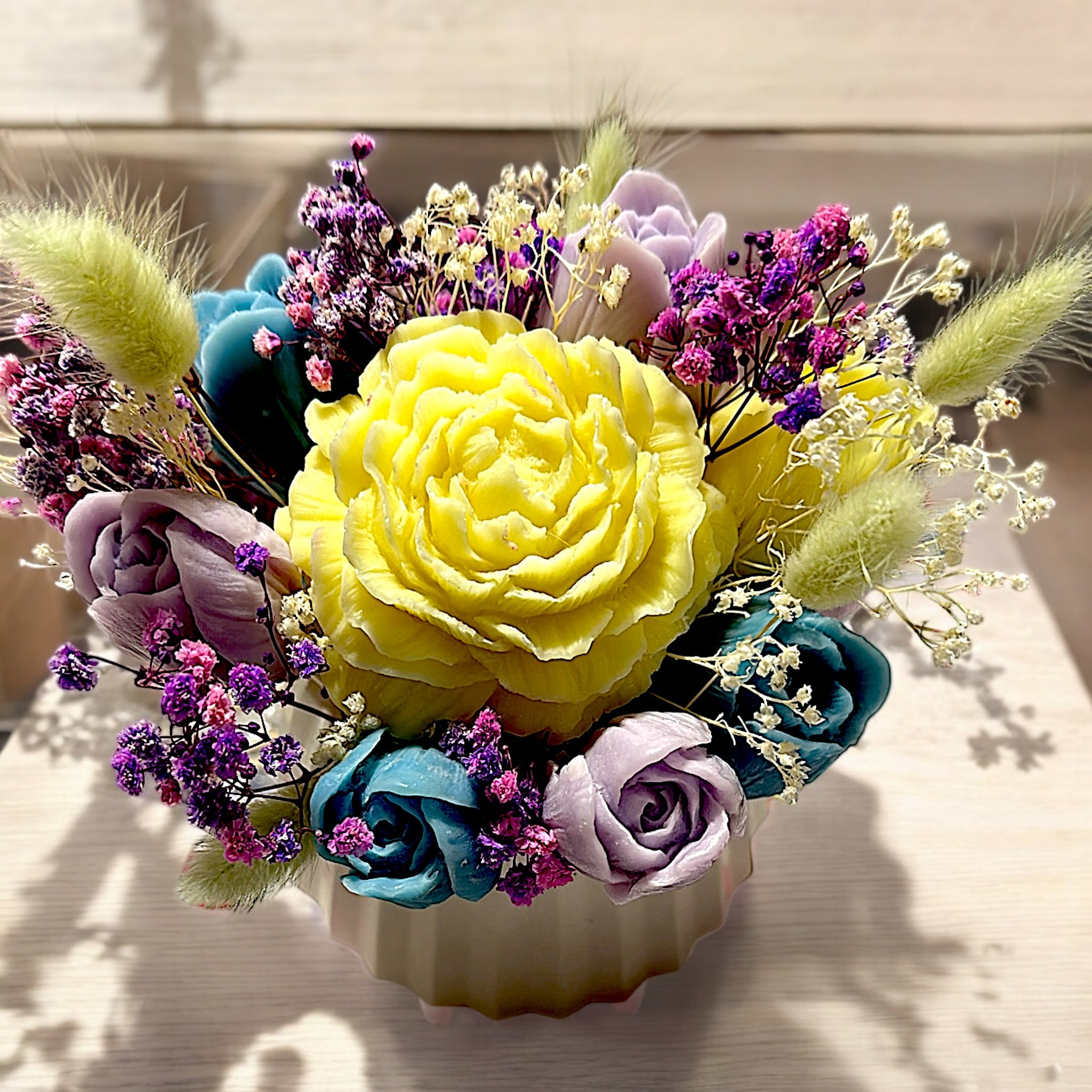 Questo vasetto in gesso ceramico è una poesia di peonie, tulipani e margherite, arricchito da fiori stabilizzati e avvolto nel delicato profumo di peonia. Personalizza i colori e porta un tocco di bellezza unica nella tua casa!